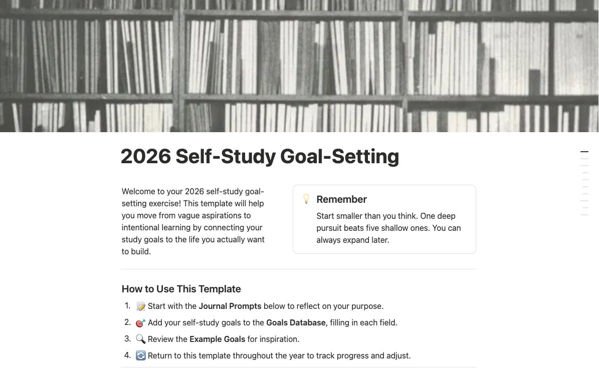 If this resonates with you, consider becoming a paid subscriber to join the conversation! And stay tuned for the next article in the series, “Your 2026 personal curriculum starts here”, where we’ll use another Notion template to map out a concrete plan for our curricula.